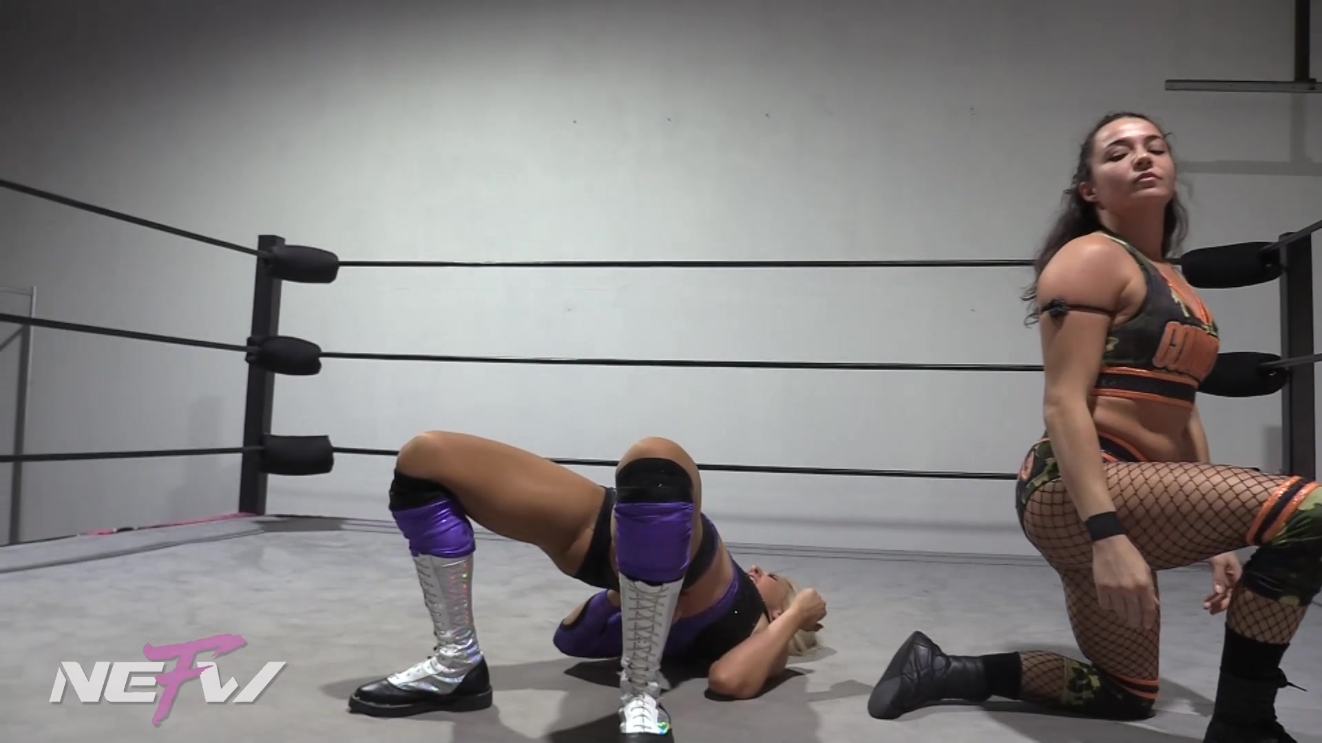 Ray Lyn is in the ring talking smack, but Christina’s done listening. She cuts her off with a kick to the gut and drills her with multiple snap suplexes, leaving Ray gasping on the mat. Christina targets the back relentlessly heavy shoulder tackles, hard buckles while Ray desperately bridges to ease the pain. Christina plants her with an over the knee backbreaker, follows with a series of body slams, and ends it with a crushing side suplex, leaving Ray stuck in a pained bridge in the middle of the ring.