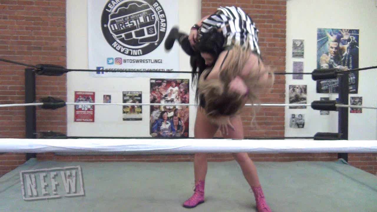 When Maria’s opponent doesn’t show, she immediately blames Buggy and starts taking her aggression out on her! When Kelly sees this, she runs in and breaks up the impending doom. Kelly brings the fight (appropriately sized) to Maria. Slamming Maria by the face from buckle to buckle, Kelly asks how Maria feels now about picking on Buggy. After some crushing encounters with the mat, Maria reverses Kelly with a clothesline and makes Kelly pay for her noble gestures. Which woman will find justice?! Click to watch!