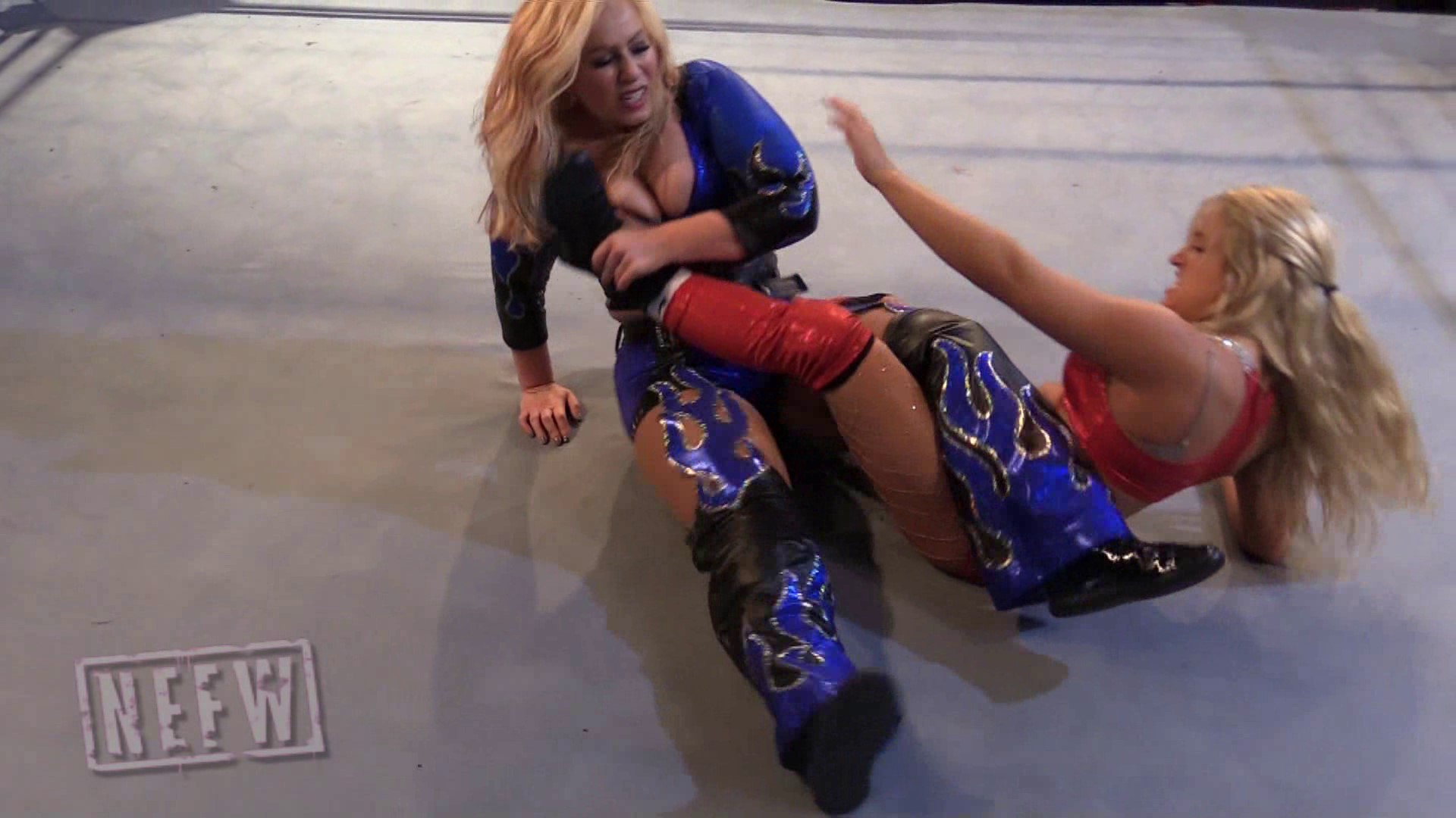 Cali is the SMARTAST blonde here. Brandi has years of experience being in the ring and we are about to see how she breaks apart Cali. Brandi goes right for the legs when she kicks and slams Cali’s leg in the mat, then right from underneath her causing Cali to fall. Wasting no time, Brandi pulls Cali’s legs through the post for a figure four variation using said post! Cali manages to get to her feet and wails on Brandi, trying to capitalize and get Brandi down. Unfortunate for Cali, Brandi has built a strong resistance over time and is resilient to a lot of Cali’s offense. Brandi takes Cali for a ride and you’re going to want to get on and hold tight!