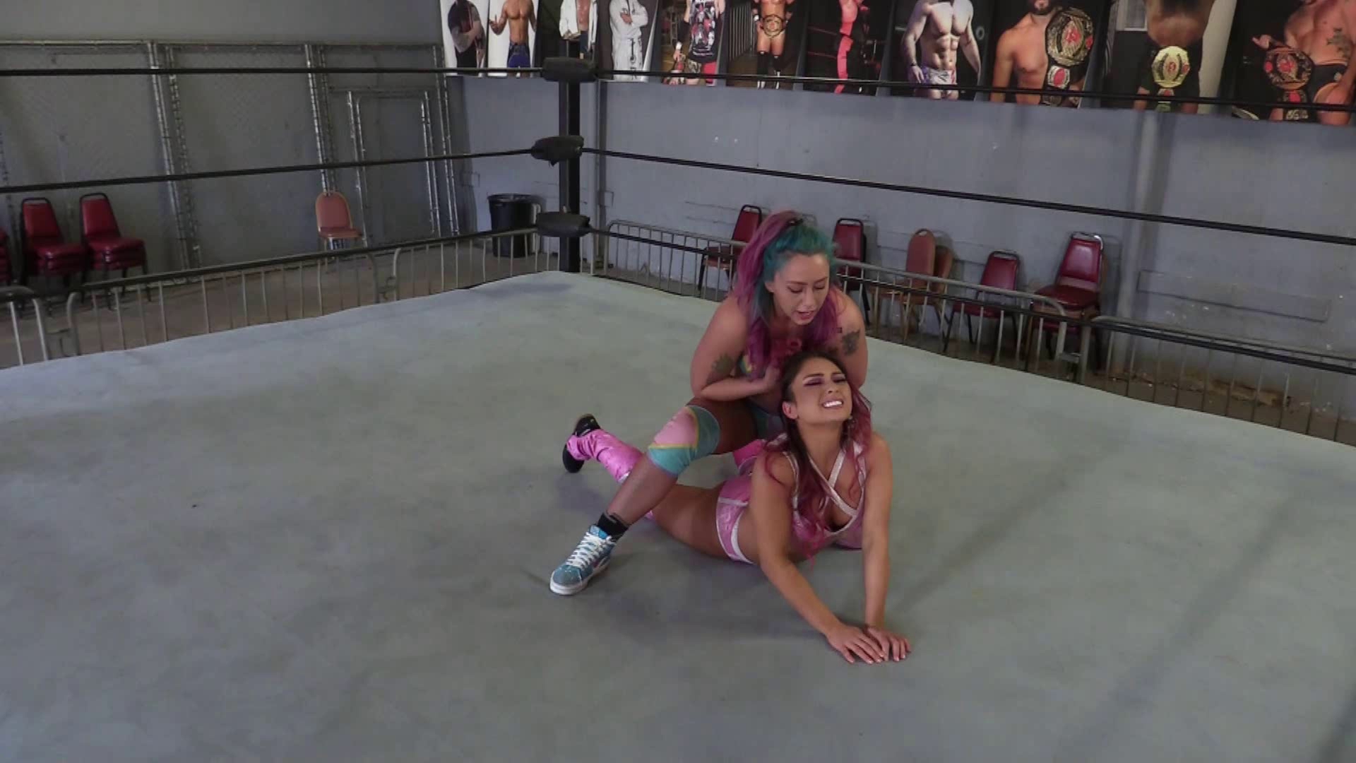 Alex is passed out in the center of the ring and Layne looks happy to have the upper hand, after a slapsgiving wake up call. Layne plans on taking full advantage, slamming Alex’s head into every buckle and draping her back by her hair over the top buckle of the last one…pulling down. Unfortunately for Layne, Alex has little to no fight in her. A ten count is easy for Layne to achieve in theory, but Alex is just awake enough to kick out. Layne tries her hand at submitting Alex with a hair pulling camel cluck and sleeper. Alex is passed out after the sleeper, but Layne has more fun to have. Alex comes to while draped over the middle rope with her hair tied to it! Still kicking out of the covers, Alex is frustrating Layne more and more. A walk about the ring by her hair, Alex takes the mat face first. How much more can she take with two back to back hair pulling, beat downs?!