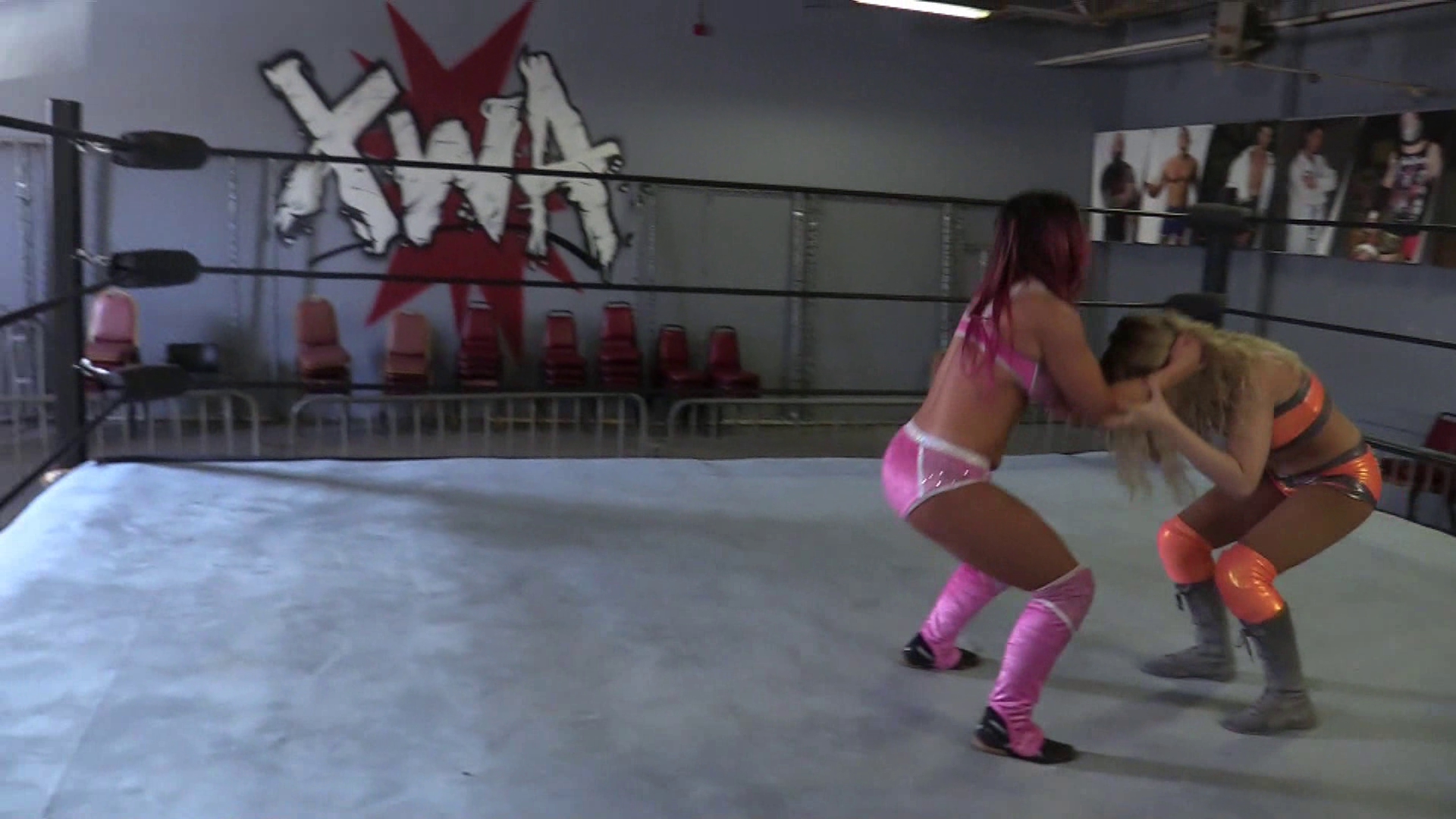 Alisha admires the adorable Alex and asks her name. Taking offense when Alex doesn’t know Alisha’s name causes Alisha to knock Alex in the corner and put the boots to her. Quickly getting a cover for a five count, Alisha makes the rules official. All pins will have to be a five count. Alex gets thrown in the opposite buckle and Alisha runs full speed into Alex with two stinkfaces! Alex is feeling the effects of the powerful derrière of Alisha who then takes Alex down to the mat with another five count. Feeling herself, Alisha takes just long enough to pull off an elbow drop to give Alex enough time to get out of the way to pop Alisha with an X-Factor. Now Alex is running a sweet, little payback on Alisha. Alex stomps and chokes Alisha with her foot in the corner. Five count pin for Alex starts evening the match and Alisha is surprised at Alex’s tenacity and this might just cost Alisha the match. Watch to see!