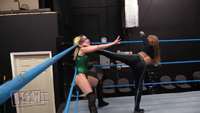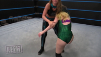 Aspyn Rose is hesitant to start her match with Dream Girl Ellie because she’s not confident in her test of strength skills. Aspen starts the test of strength but quickly finds a sneaky way out of it. They have a back and forth pro wrestling match, and Dream Girl Ellie gets the win with a leg scissor, sleeper hold knockout!
