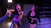 Jenny claims Sam is stealing her lines, while tension becomes high the girls find themselves in a shoving match that leads to a real battle. Jenny catches Sam off guard and starts to toss her around the ring, slamming from corner to corner, and choking her on the ropes. She slingshots Sam and delivers a sidewalk slam, but Sam fires up and catches Jenny with a solid clothes line! The girls continue to go back and forth battling with moves like Sleeper hold, arm bar, leg drop, and Russian leg sweep.