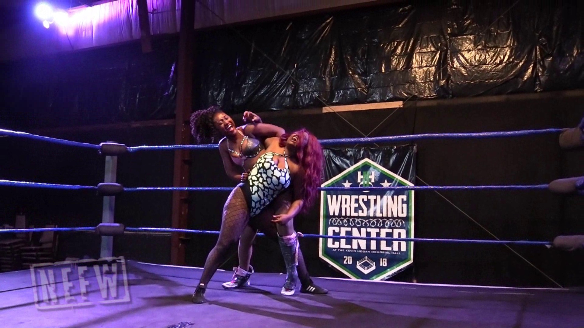 Aminata and Joseline start off flirty and handsy as they start their match, however they get down business and Aminata takes control. Aminta backs Joseline into the corner and gives her a stink face, moving her to the center of the ring for another flashy stink face. Continuing the frisky mood between the girls Joseline groups Aminta, but finds herself quickly in an ab stretch! The girls continue to go back and forth with stink faces, bear hugs, body scissor, figure four leg lock, sleeper hold, and various pins.