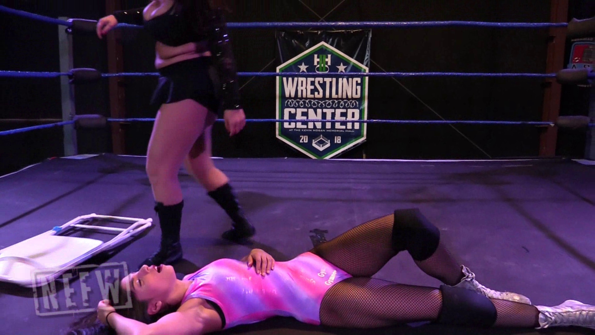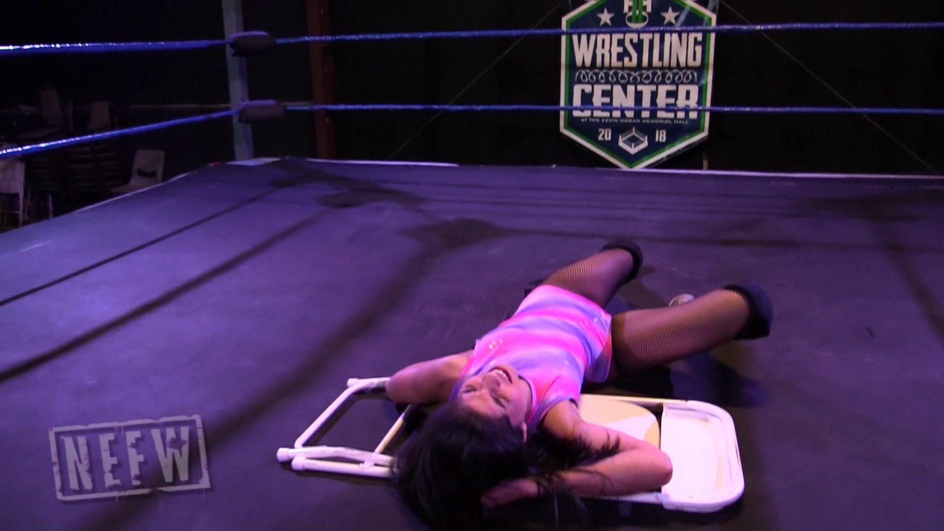 Sam is on the outside of the ring checking herself out in her phone mirror, talking very cocky about herself, when Jenny attacks her from behind. Still on the outside of the ring Jenny starts to beat down Sam, tossing her into a chair and the ring mat. Jenny brings Sam into the ring, along with the chair. Jenny starts to deliver kicks and punches to Sam and slams her back onto the chair in the center of the ring. After a brutal beating Jenny finally knocks out Sam with a Sleeper Hold.