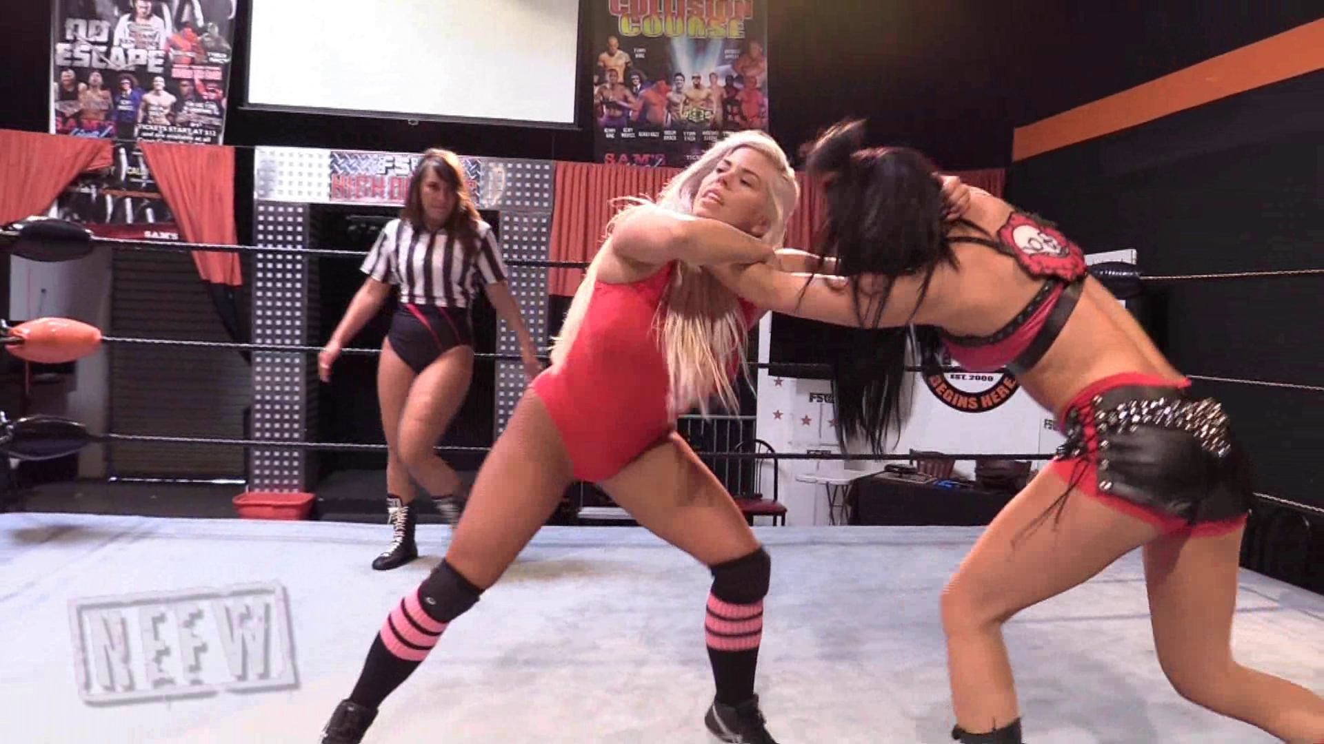Referee for this match explains that this is a Two out of Three falls match, and introduces the competitors Barbi and CJ. During the intro Barbi is very cocky and confident that she is a better wrestler than CJ. Barbi takes control early on in the match and slaps on a standing Sleeper Hold, breaking CJ down until hers seated on the mat knocked out. Barbi wins the first fall with the knockout. After CJ regains composure they girls lock up again for the second fall, Barbi Slaps on ANOTHER sleeper hold straight from the lock up, and it seems that CJ has fallen for the same hold again, and finding herself knocked out again on the mat, making Barbi the winner of this match.