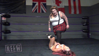It’s one of Alex Garcia’s first ever matches with NEFW, and she’s issuing an open challenge to anyone in the NEFW locker room! Baby D enters the ring laughing at Alex’s challenge and says she is going to flatten her like a pancake! Alex catches Baby D with some flashy high flying moves right away, but when she goes to the top rope, Baby D knock her off. They have a back and forth match, Baby D get the best of Alex with multiple butt drops, and splash, leaving Alex Garcia knocked out cold in the center of the ring.