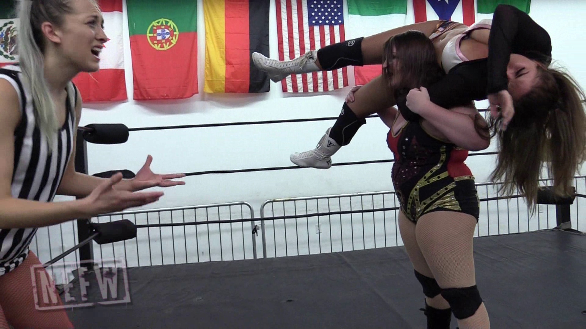 Davy immediately beats down Casey. Kicks to the gut, pummels her to the ground but lifts Casey up before the three count. Ava has quite the fear of this force to be reckoned with in one half of the Top Dogs. Choking in the corner with Davy’s boot, Casey struggles to breathe. That second she takes is enough time for Davy to lift Casey for repeated back breakers. Ava seems to be under the strict instruction of Davienne and counts the first fall to Davienne. After this fall Casey wants to quit but the best out of three is only by pin fall. No quitting allowed. Casey takes a hard buckle to the face and is knocked loopy, with just enough life to feel the choking that comes next. Barely being able to handle the pain, Casey even taps in a Boston crab, but it doesn’t count towards a fall. What will Davy do next?!