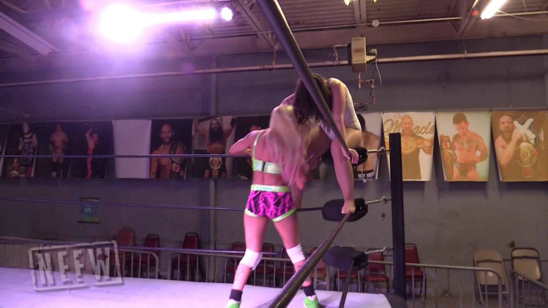 Allie is stretching outside the ring, when Dani Mo sneaks up behind her and slaps on a Sleeper Hold! Dani then picks Allie up in a Fallaway Slam position, and slams her back against multiple metal ring posts. Eventually Dai tosses Allie into the ring, but the torment doesn't stop there, she continues to pick her up and walk her around the ring slowly. After a few rounds of slamming Allie’s head into turnbuckles, and a brutal Ab Stretch, Dani pushes to Knock Allie Out! She puts Allie to sleep with multiple Fireman's Carry, Fallaway Slam Carries.