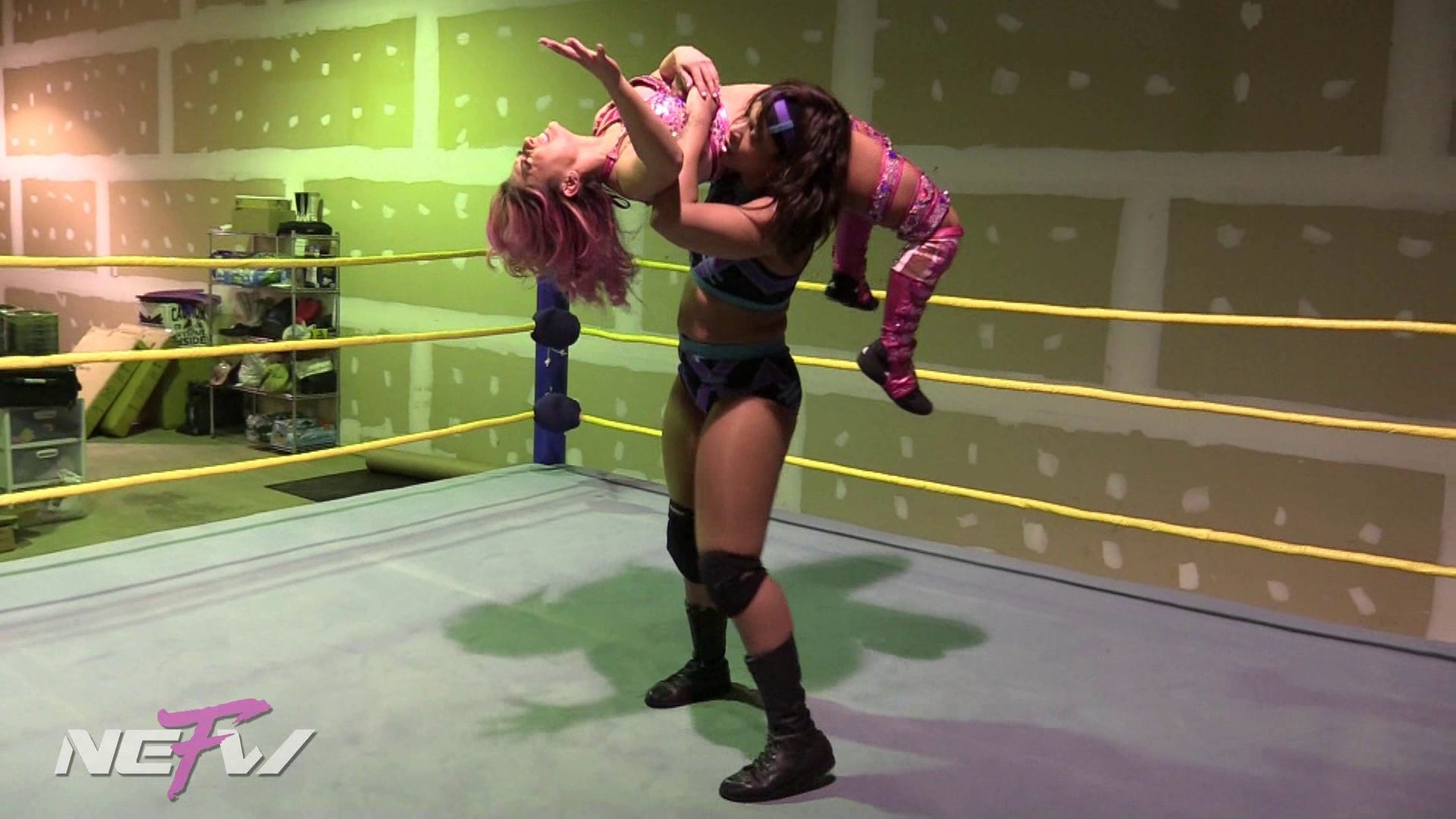 Holidead starts this clip dragging Alex from the locker room to the ring! Before they enter the ring, Holidead beats Alex down using various objects on the outside, and the ring posts! Once Holidead tosses Alex into the ring the real beat down begins. Holidead tosses Alex around the ring with maneuvers like Over the Shoulder Carry, Headscissor, SurfBoard, and finishes her off with 3 strong Implant Busters.