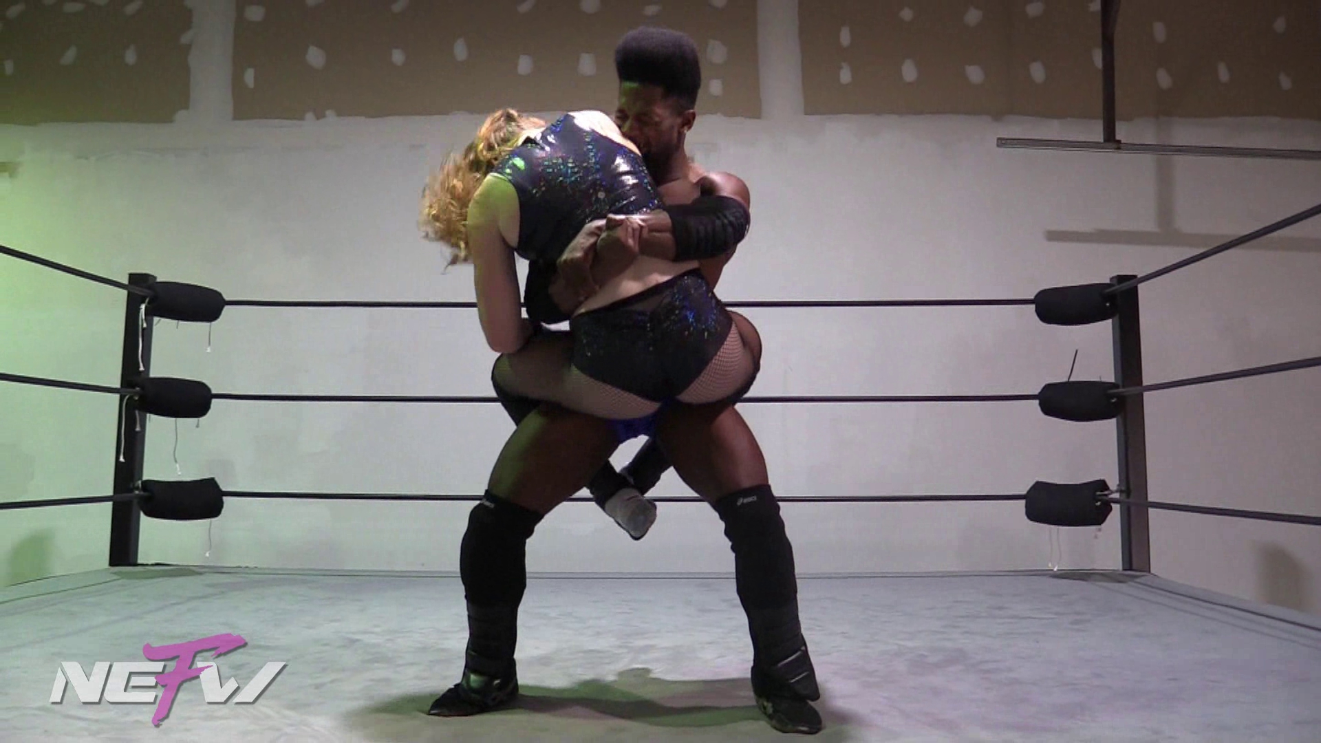 Mimi and Anthony start their match off hot and fast! However Anthony takes control right away and puts Mimi in holds like Sleeper Hold, Bear Hug, Body Slams, Suplex, all while knocking her out and waking her back up again. When he is finally done with her he picks her up into a Cradle Carry and walks her lifeless body around the ring.