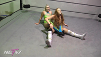 Heather and Mimi circle as they're about to start their match when Mimi challenges Heather to a test of strength! The girls have a back and forth match with moves like Head Scissor, Bear Hug, Body Scissor, Boston Crab, and DDT. In the end Mimi takes the win, leaving Heather beaten on the mat.