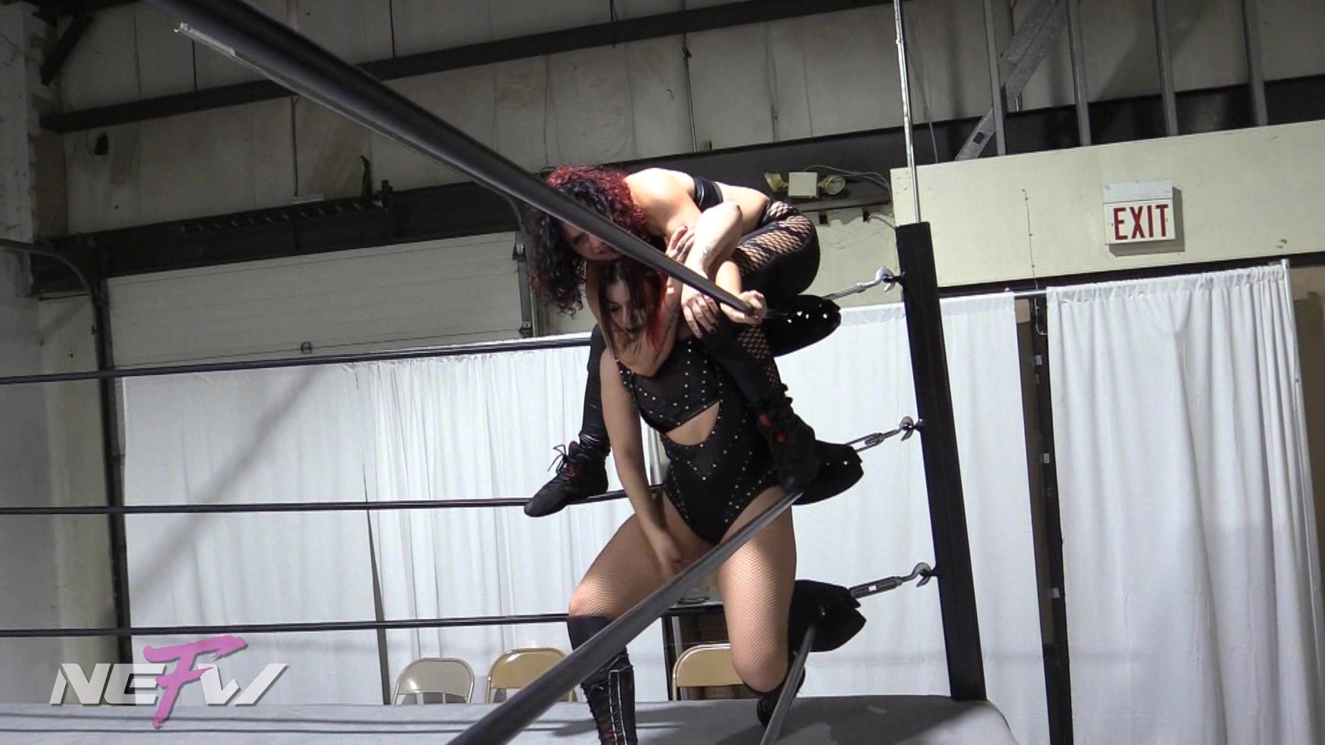 Tag partners Masha and Killer Kelly are in the middle of a training session and Masha is getting frustrated with her partner being a step slower than usual. So Masha decides to tell her step up her game in a language they both understand, violence. Masha starts beating Kelly all around the ring and outside the ring and choking her unconscious. She introduces a steel chair into the fray, smashing Kelly face first into the chair, and slamming the chair across Kelly’s back also. When Masha thinks she has gotten her point across she delivers her Snow Plow finisher to Kelly and pins her for the 1, 2, 3.