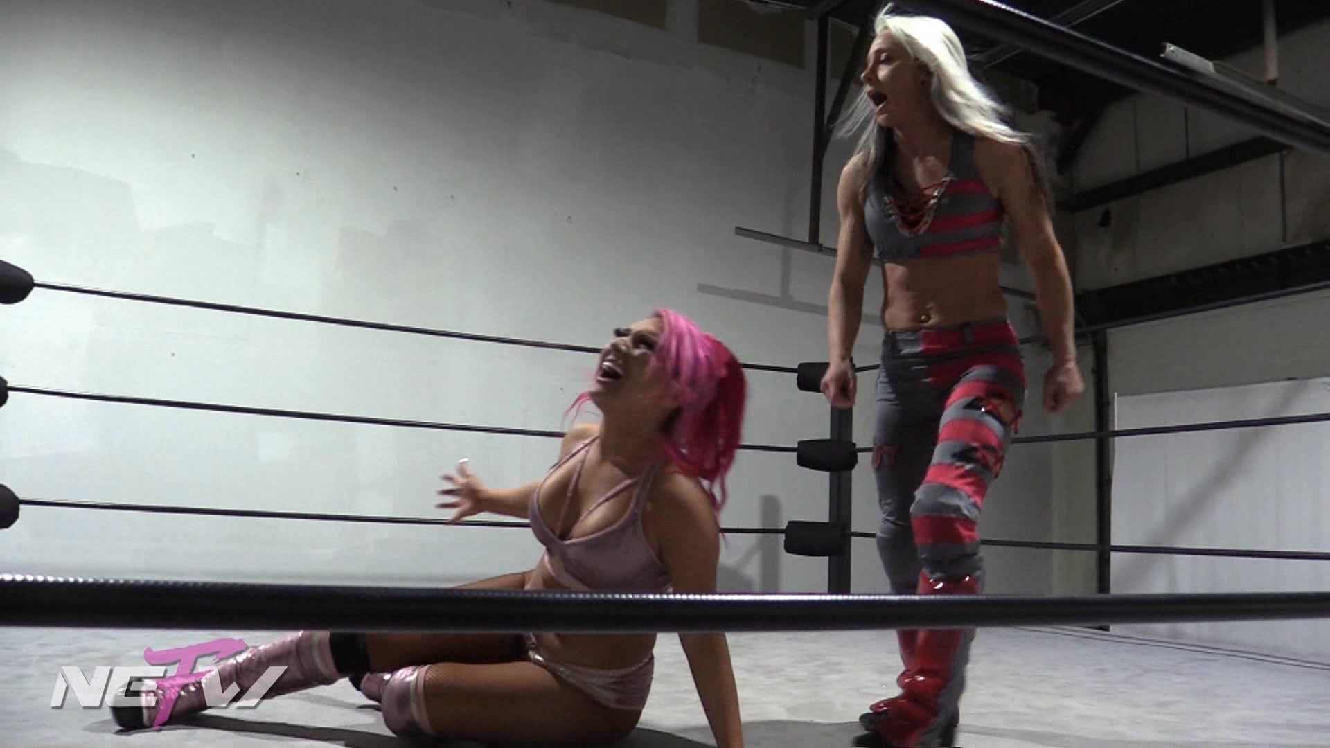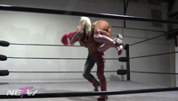 Alex is a little upset that someone like her has to face off against a newcomer making her NEFW debut, Zoey Skye. But even though Zoey is making her debut, she is no rookie. When Alex goes to attack Zoey she is able to dodge her attack and lift her up and spin her around dazing and disorienting her and allowing Zoey to get an early pinfall. Alex protests and says this is a 4 corners match, so the pinfall doesn’t count. But this doesn’t faze Zoey as she just proceeds to dominate Alex anyways, before carrying her out of the ring and to the back.