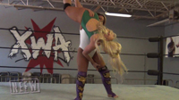 Solo backs Barbi into a buckle to break Barbi’s waist lock. Quick to show off her hot moves, Solo body slams and airplane spins Barbi for the five count cover! Barbi can’t lose that quickly though, so she proposes a best out of 3 falls match. Barbi beats down Solo with stomps and body slams. Solo is less pleased with this arrangement as she is airplane spun and covered for a five count! Barbi slams Solo head first into the buckle then chokes Solo on the top rope. Barefooted, Barbi kicks and stands on Solo’s back. With the odds 50/50, but Solo getting her back really worn in, who will win the next fall?! Click to watch!
