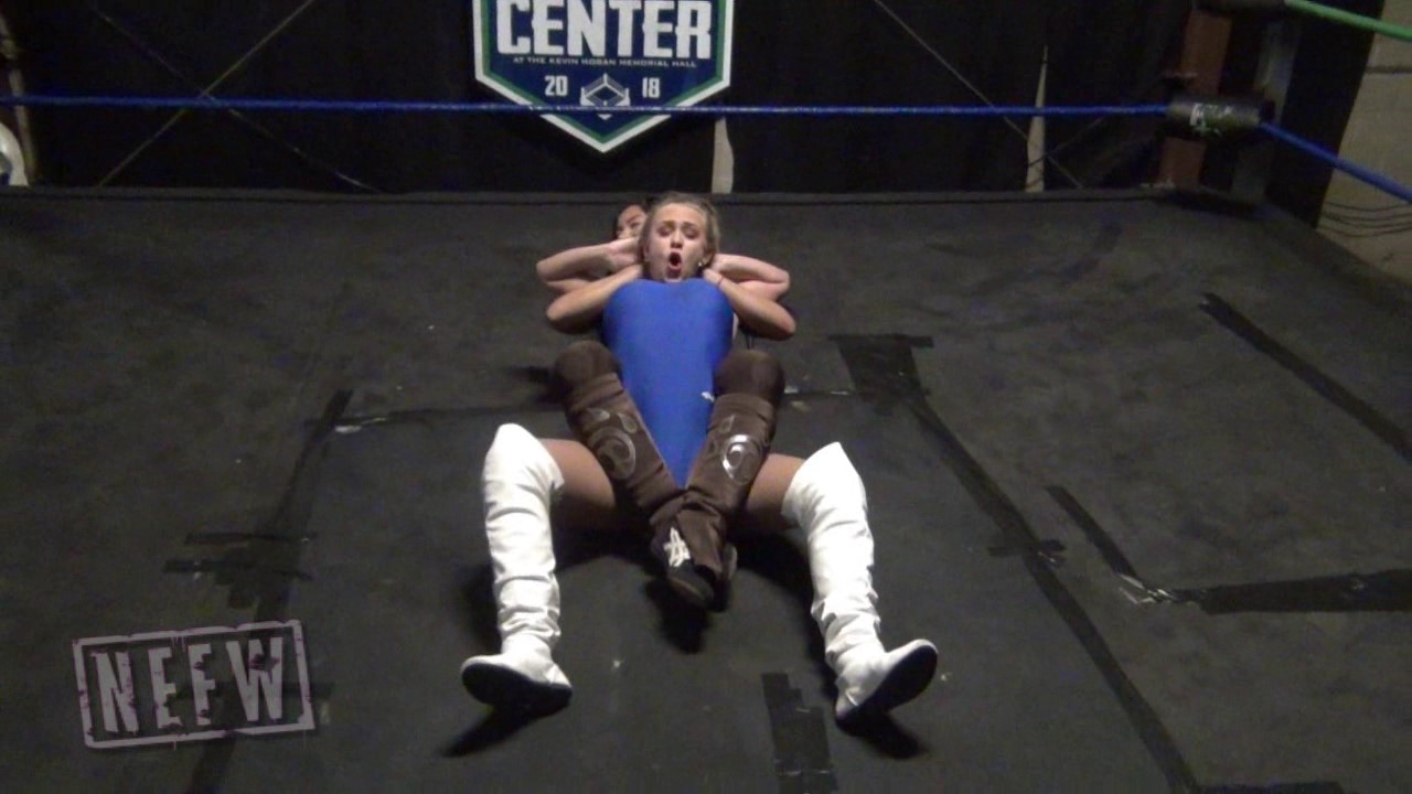The tension is thick here between Penelope and Hania, already leading with claws out. Fierce lock up with neither giving up control till they break clean. Second lock up backs Penelope in a corner but a third try sends Hania around for a go behind. Penelope slips behind to reverse Hania. Neither staying long, Hania and Penelope trade hammer locks till Penelope is on the ropes getting her arms stretched on the top rope by Hania. Back in a headlock Penelope ends, getting taken over. Penelope shoves Hania’s head into her leg scissors but Hania rolls to find relief, floating into a sleeper hold. As Penelope fights out, Hania locks her legs around Penelope’s waist, squeezing tightly. The more Penelope struggles, the more Hania pulls her hair and tightens her grip. When it looks like Penelope is getting around, Hania locks a cross face on and Penelope loses the first fall. Just wait and see what’s next! Download here!