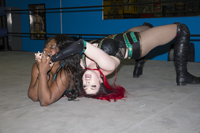 Taeler kicks and strikes Latasha down, slamming every body part on the mat. Taeler harnesses her inner villain to take apart little Latasha, but Latasha keeps getting up! Taeler swiftly locks on a Muda lock but Latasha lives! With sidewalk slams, camel clutches and cross faces, Taeler shows zero mercy. Latasha fights up from the bottom but Taeler has devastated Latasha’s back. Passing out from pain, Latasha taps out to Taeler! Click to see NEFW’s own poison ivy, Taeler administer some serious damage.