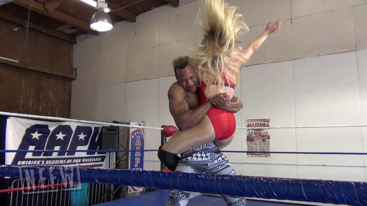 Leah tries a quick diversion and gets a DDT on Blair, but when she goes for a second he counters. From there he dominates Leah with multiple bear hugs, slams, suplexes and submissions like scissors, ab stretch, and more. He pins her after a belly to belly suplex, followed by a samoan drop. But he isn’t satisfied yet, as he strips off her boots and then tombstone piledrives Leah out cold.