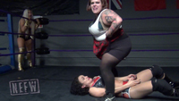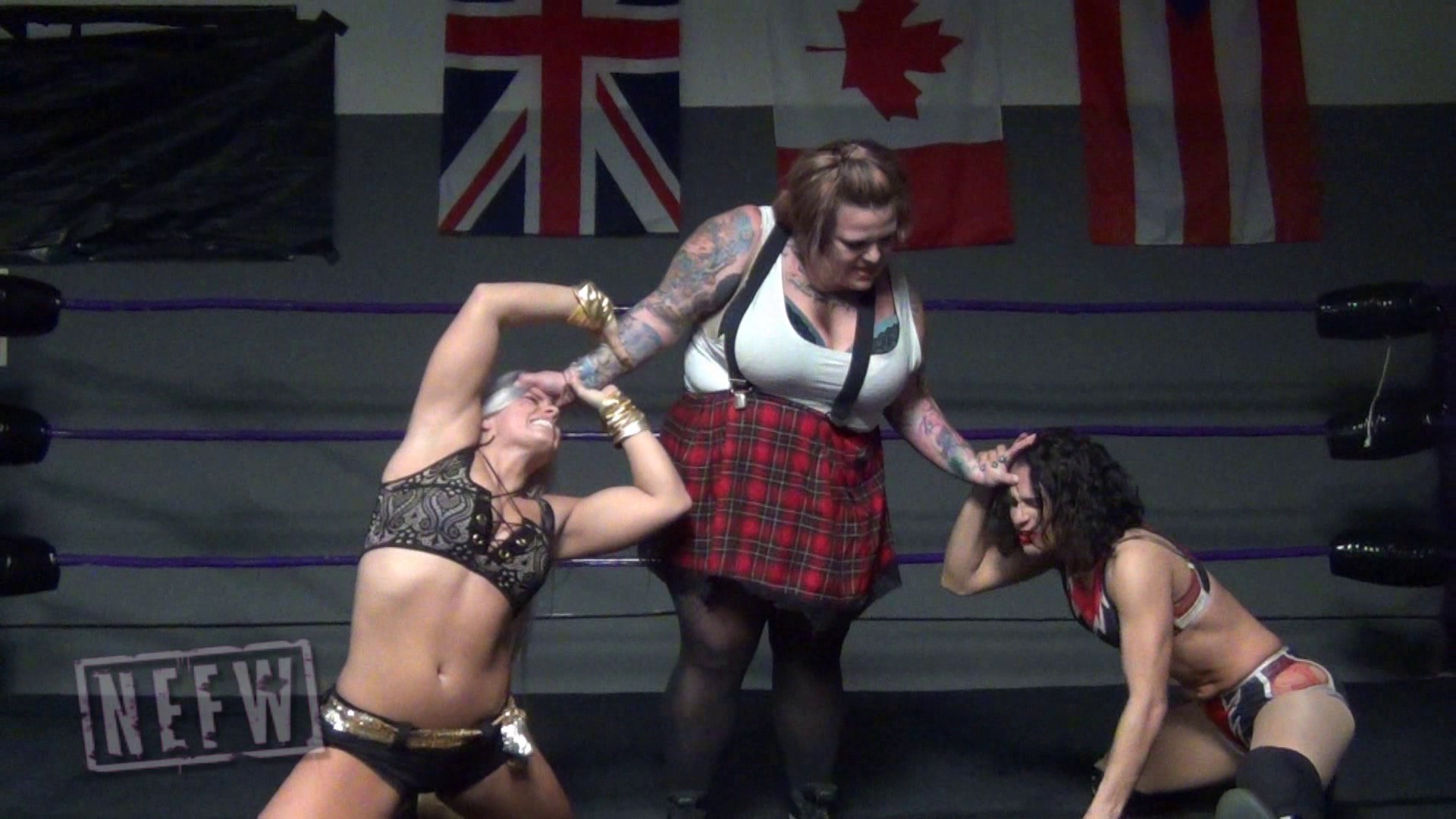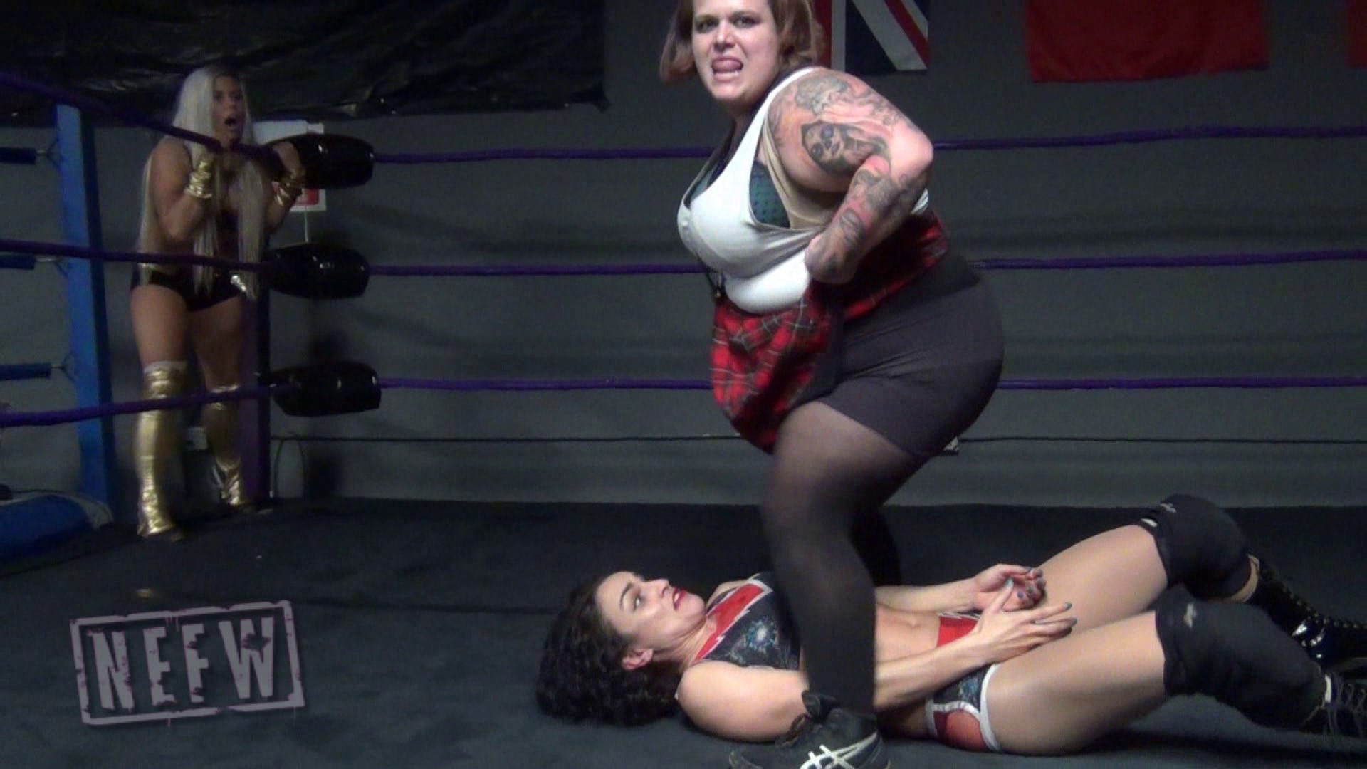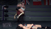 Unlike the other debuts at this shoot, this particular debuting wrestler came in calling out the best that NEFW had to offer. And she gets just that as Baby D makes her debut against not one, but two of NEFW’s best in a 2 on 1 match against Barbi Hayden and Thunder Rosa. She uses her strength advantage to first take out Barbi with a sideslam followed by a long bearhug. And when Rosa tries to save Barbi, Baby D locks her in a reverse bearhug and then a vicious stomach claw. She uses more claws, bonsai drops and bearhugs to take both girls out, before piling them on top of each other and leaving them both laid out.
